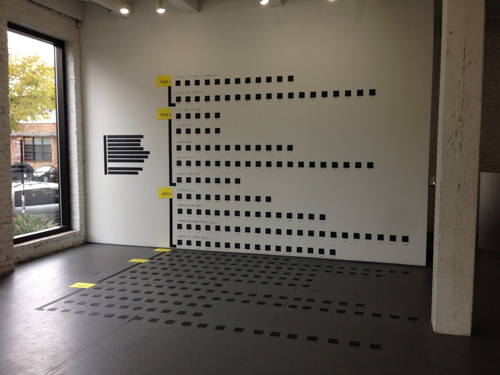 Running Begins Elsewhere was exhibited as part of “Twelve Variations,” a group exhibition at the Chicago Artists Coalition gallery in Chicago, Illinois and treated as a residency project off-site to develop the gallery material. Victoria Bradford developed over 400 stickie notes as an installation, composed of movement vocabulary and arranged in a grid outlining a training program for running. This work of choreographic notation resulted from a month-long practice attempting to execute the drills on “Proper Running Technique” contained in a 1965 Championship Football Manual.