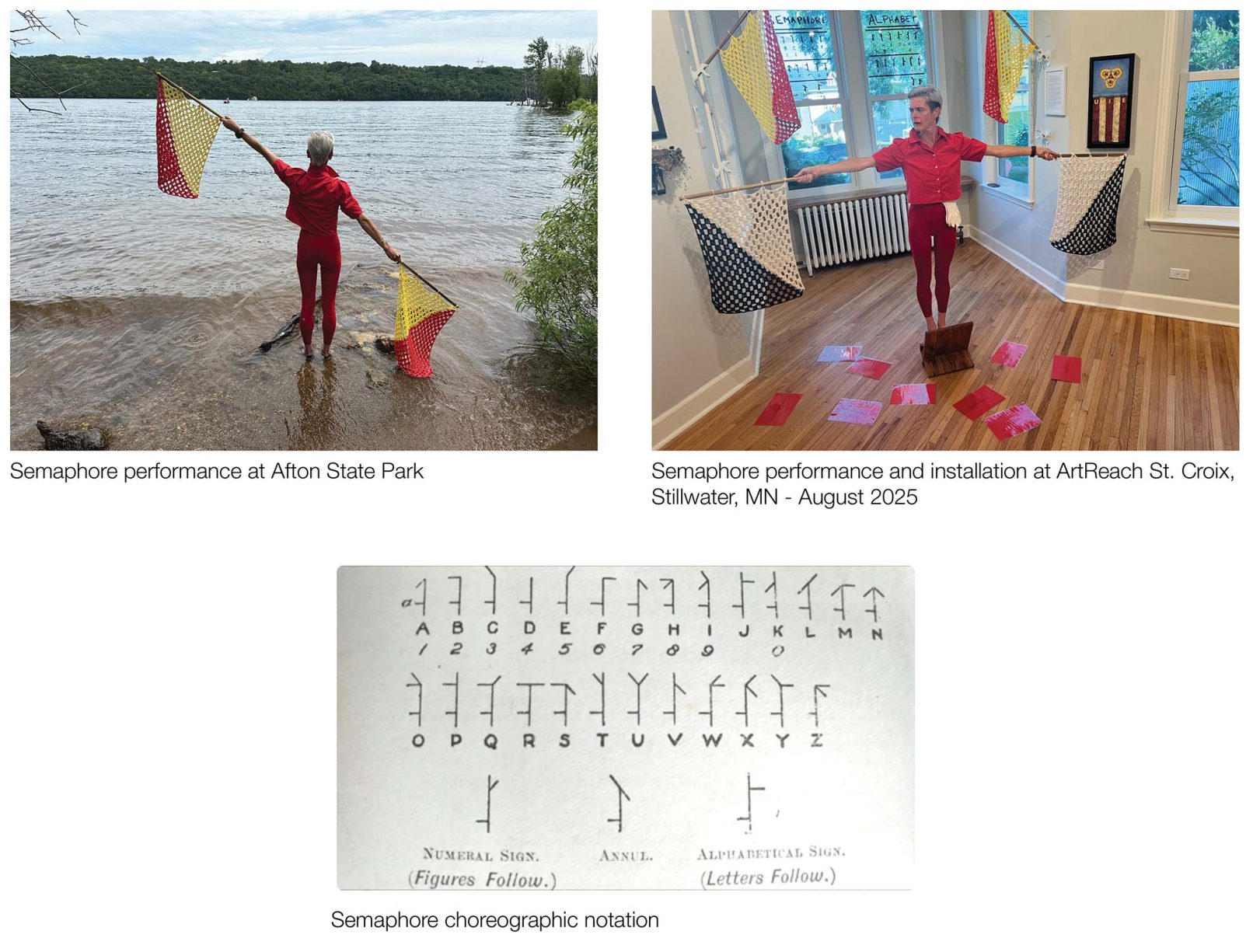 The portfolio also includes documentation of semaphore performances, in which the artist uses crocheted O (Oscar) flags in a choreographic structure to physically transmit unspoken messages. These performances have occurred in state parks and galleries, and are supported by choreographic notation systems visible in the portfolio.