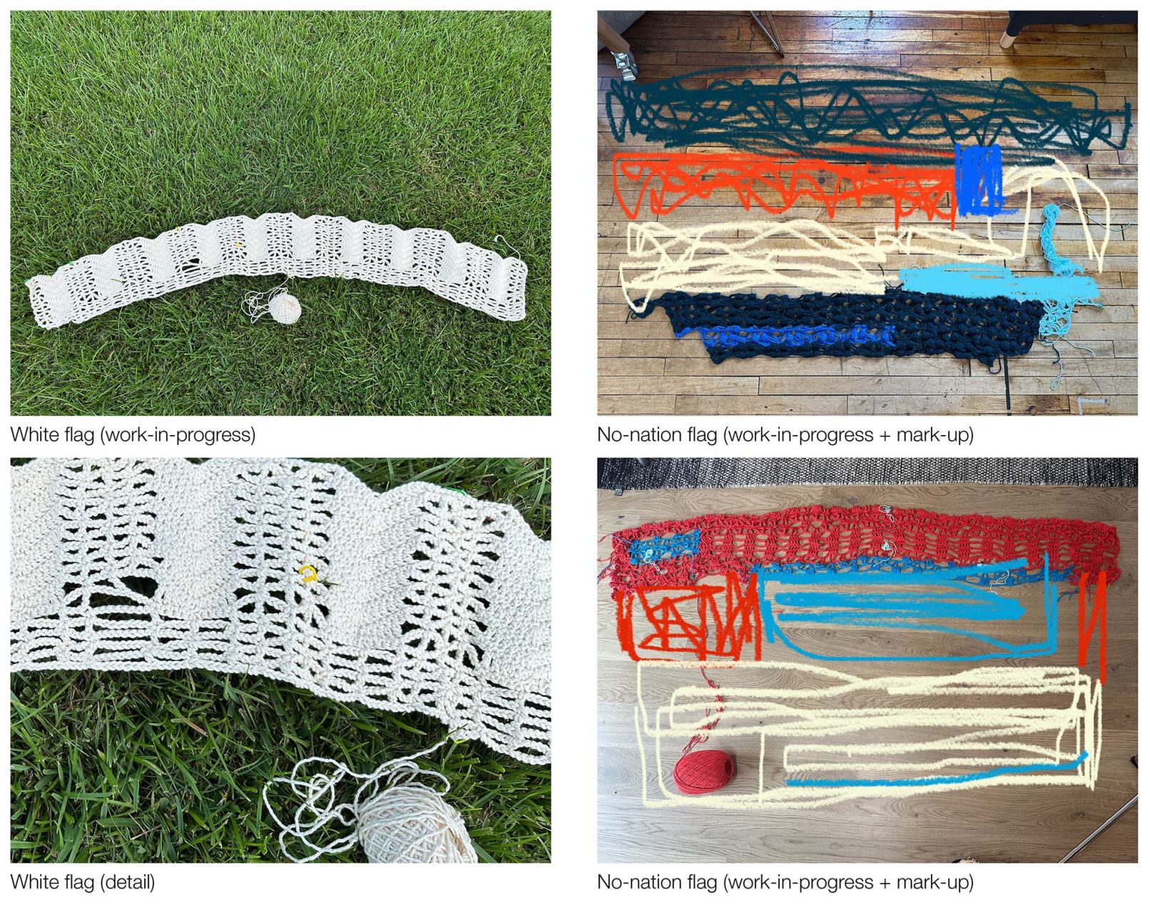 Additional components include concept flags—“white flags of surrender” crocheted in fine cotton to suggest delicacy and erasure—and “no-nation” flags that question the increase in nationalism and identity politics through improvisational design.