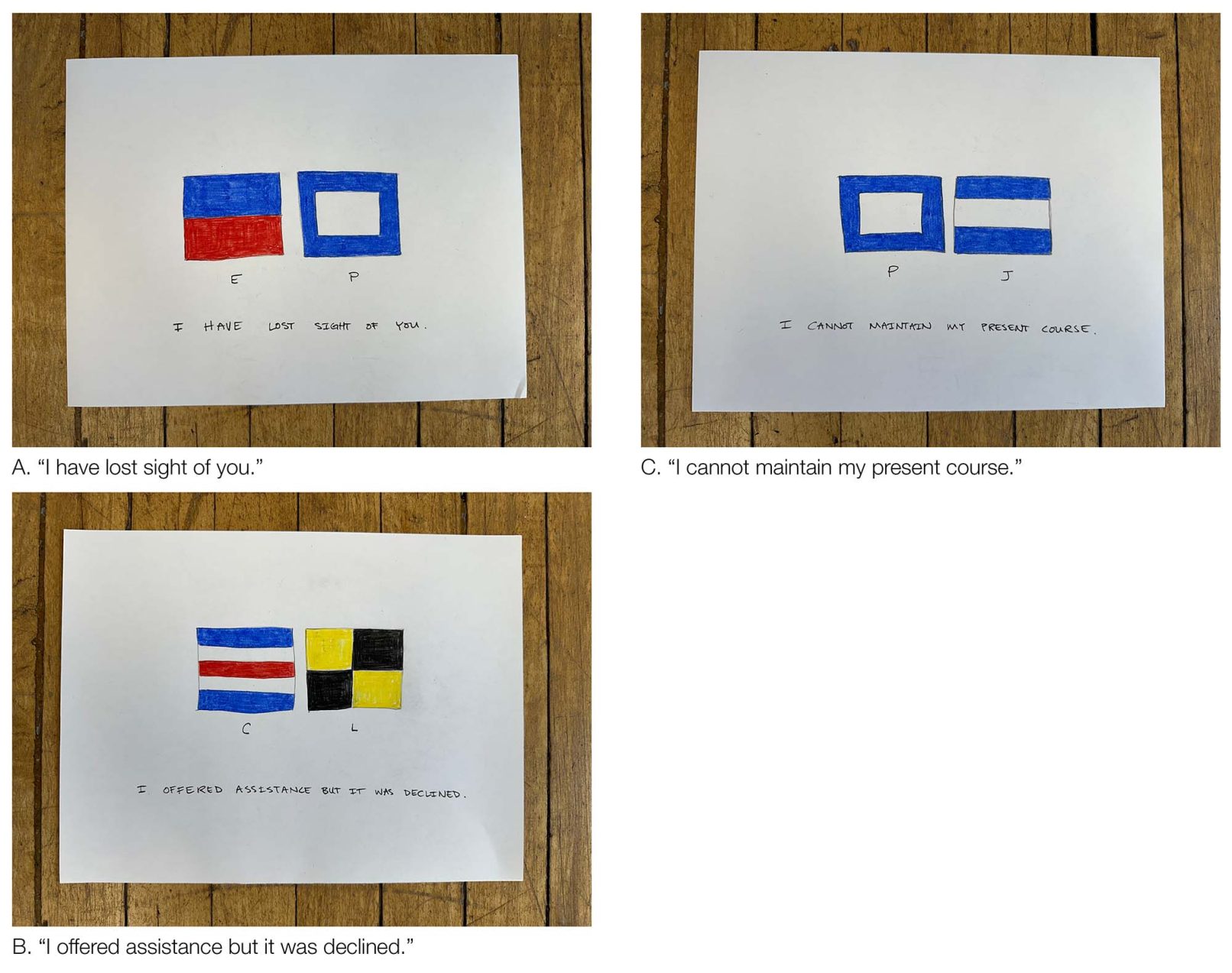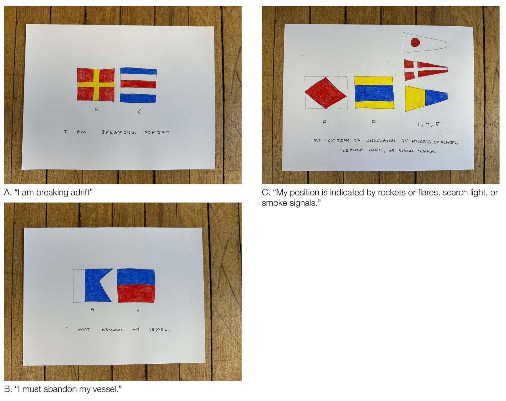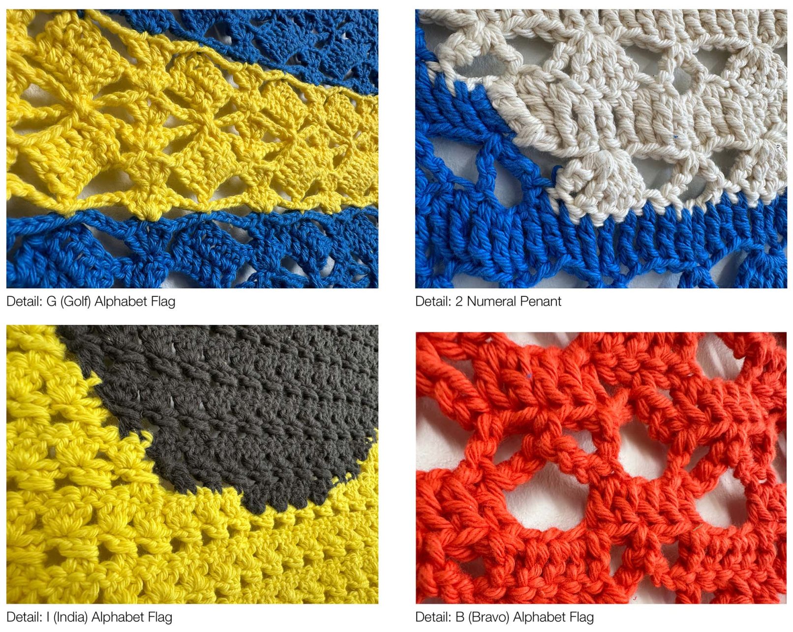 The first set of assets includes full-scale crochet signal flags, made to precise ICS specifications and sequenced to convey coded messages. These tactile works reference one of a series of “choreographed” phrases suggesting emotional resonance beneath maritime utility. Accompanying these are hand-drawn flag illustrations, pairing the poetics of coded language with delicate materiality to explore collapse, grief-tending, and resilience. Each set of illustrations is in progress of being crocheted into full-size flags for eventual exhibition.