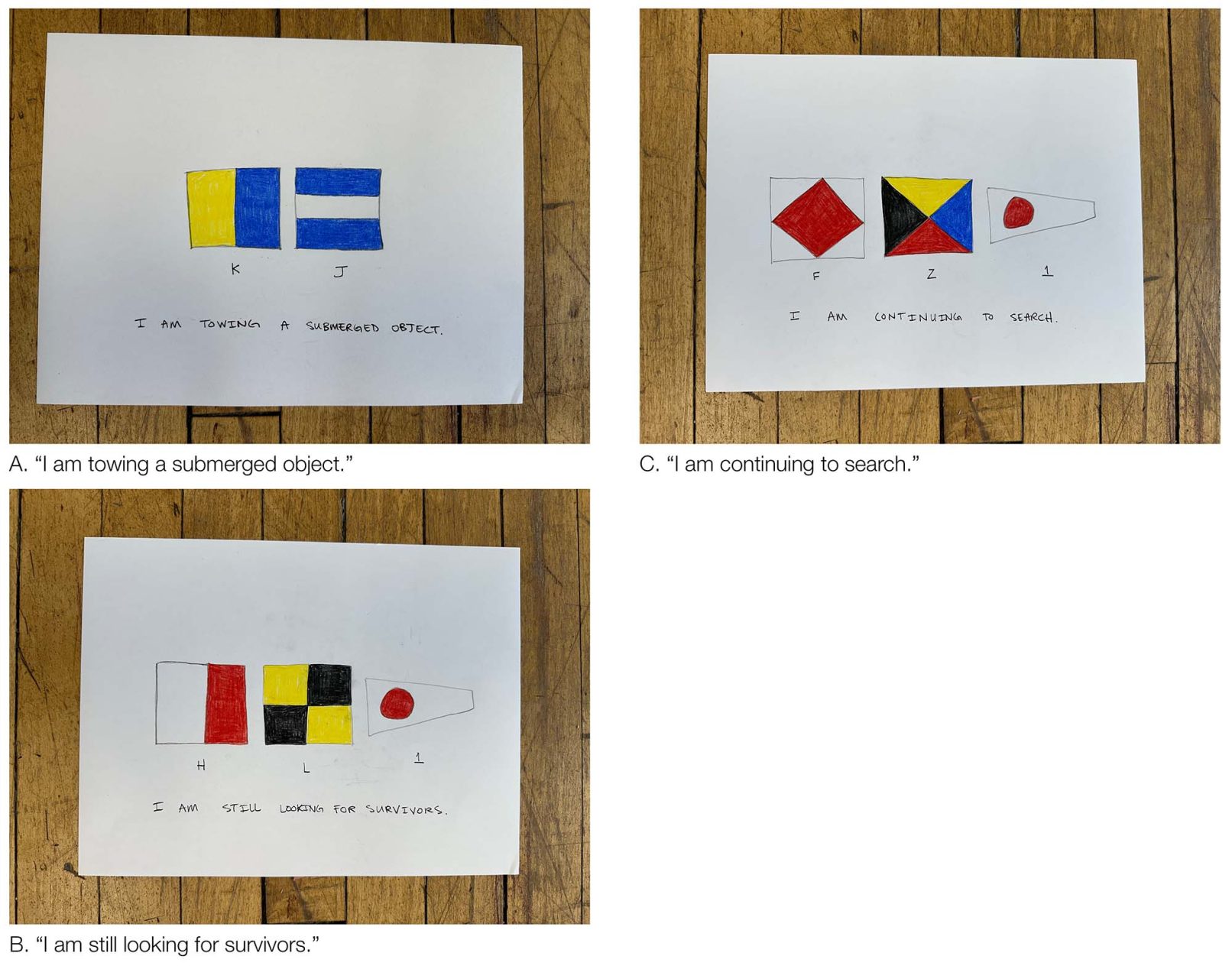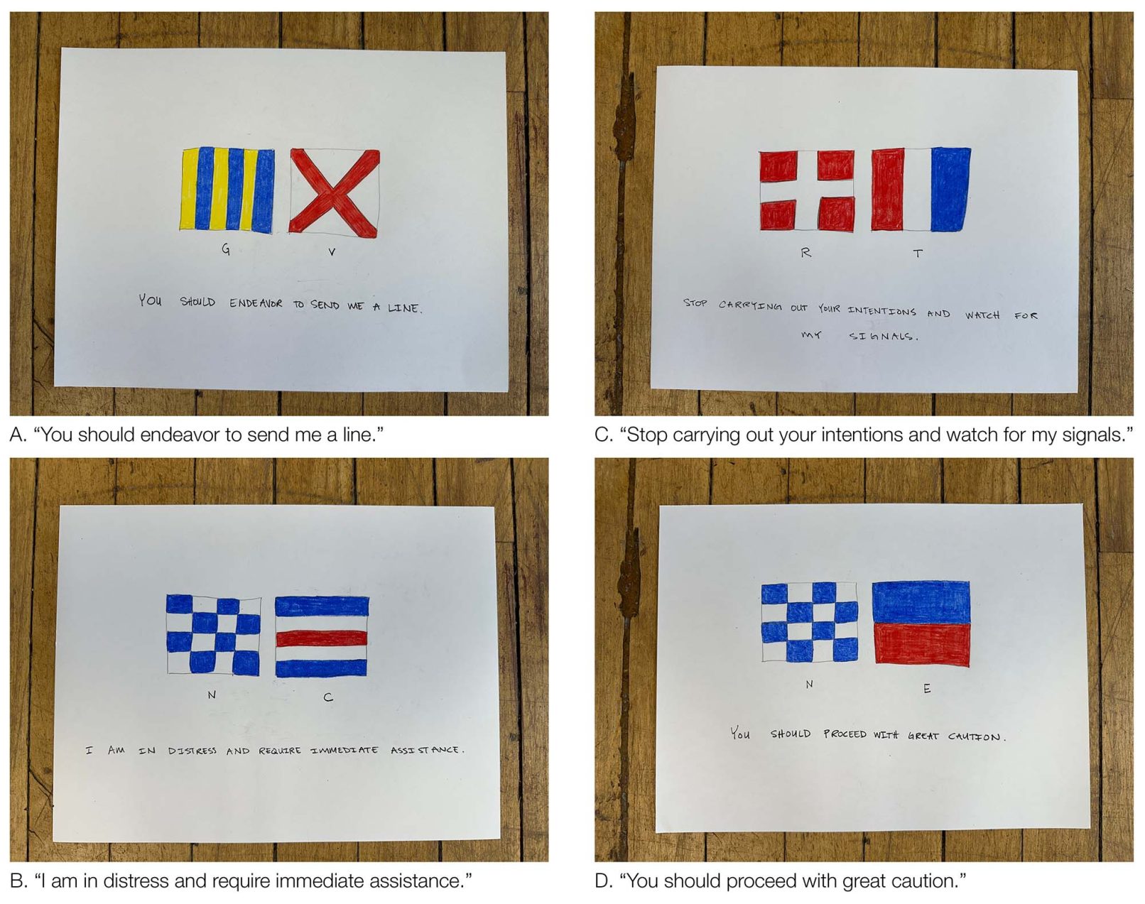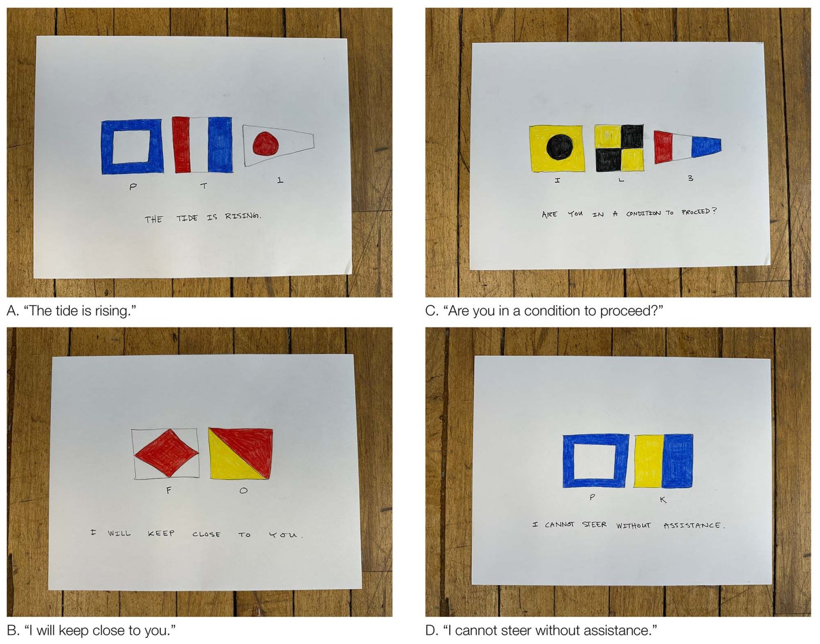 The first set of assets includes full-scale crochet signal flags, made to precise ICS specifications and sequenced to convey coded messages. These tactile works reference one of a series of “choreographed” phrases suggesting emotional resonance beneath maritime utility. Accompanying these are hand-drawn flag illustrations, pairing the poetics of coded language with delicate materiality to explore collapse, grief-tending, and resilience. Each set of illustrations is in progress of being crocheted into full-size flags for eventual exhibition.