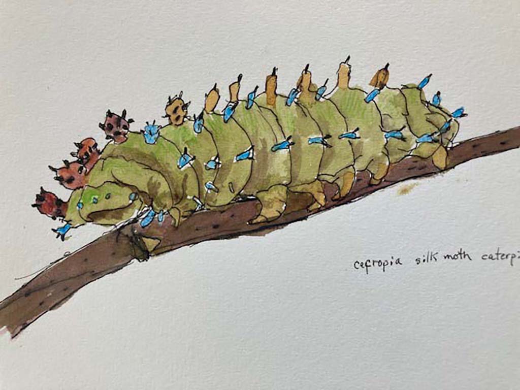 Artist Statement: The cecropia silk moth emerges from its’ brown cocoon in June. This cocoon has been attached lengthwise to a branch or building since autumn. It lives for two weeks-its only purpose to mate and lay eggs. Maple, birch, and cherry are some of the host trees for the 5 instars ( developmental stages) of the caterpillar. Many caterpillars don’t make it to maturity as they are food for a variety of animals- especially birds who favor caterpillars to feed their young.