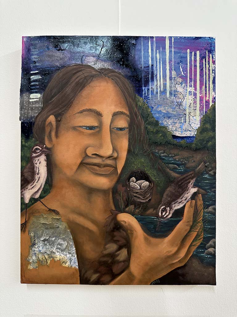 Artist Statement: The Louisiana waterthrush caught my attention when I read about how it nested close to the water’s edge, under an uprooted tree or in the bank. Though it is a vulnerable spot to raise your young, I love the idea that they are swaddled by the earth. They begin life and live life by the water’s edge, flowing south in the winter and north in the summer.